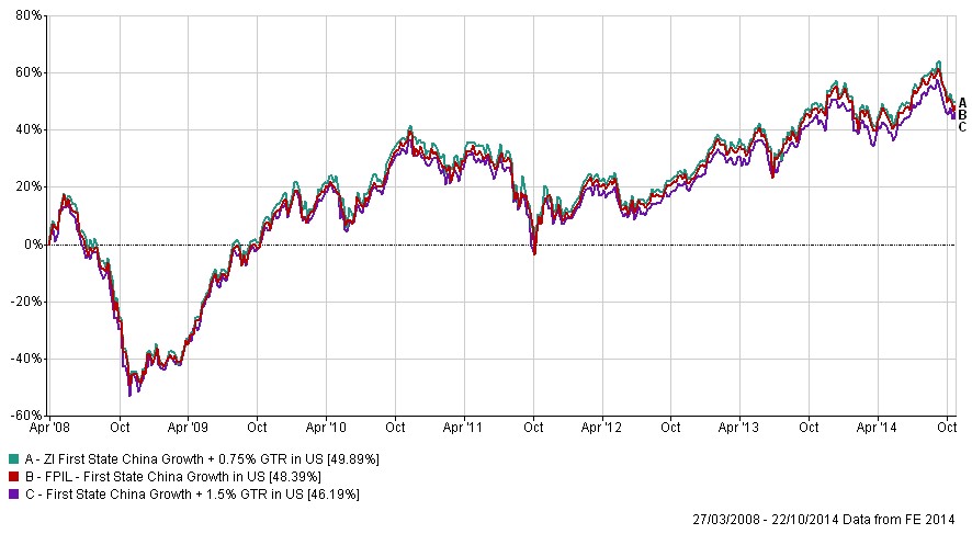 但以上只是基金層面的比較,如果從計劃層面作比較,結果便會不一樣。用直接基金的月供儲蓄計劃,一般都會有一項用扣除基金單位形式收取的計劃管理年費,而用影子基金的月供儲蓄計劃,這項收費是較低甚至是沒有的。例如富衛的智非凡計劃和忠利的前景計劃,都會有一項每年收取1.5%的管理費用,而蘇黎世的豐盛人生計劃,這項費用只是0.75%,友誠的計劃更是沒有這項費用的。如果將這個費用加入後才比較,便會發現用直接基金的計劃和用影子基金計劃的回報分別不大(圖一︰A線是蘇黎世的影子基金加0.75%費用,B線是友誠的影子基金,C線是直接基金加1.5%費用)。